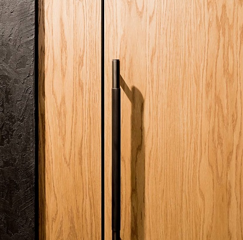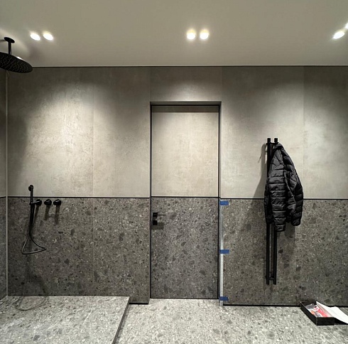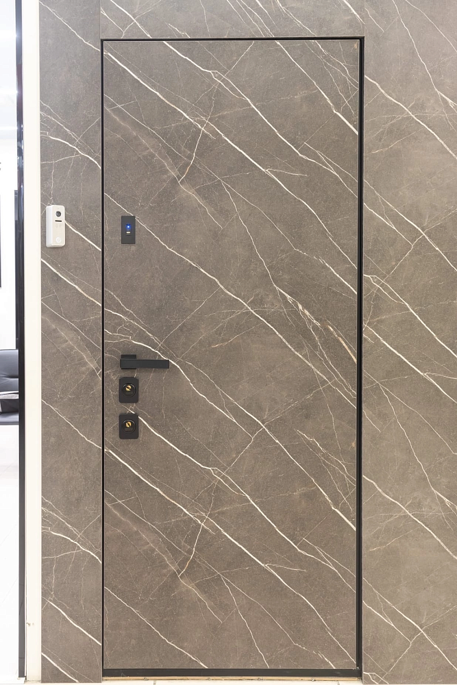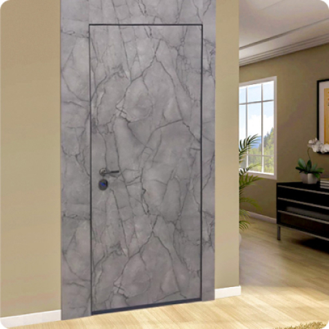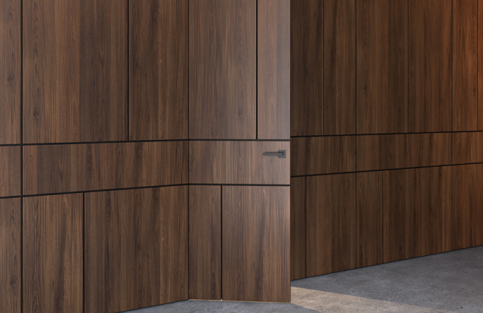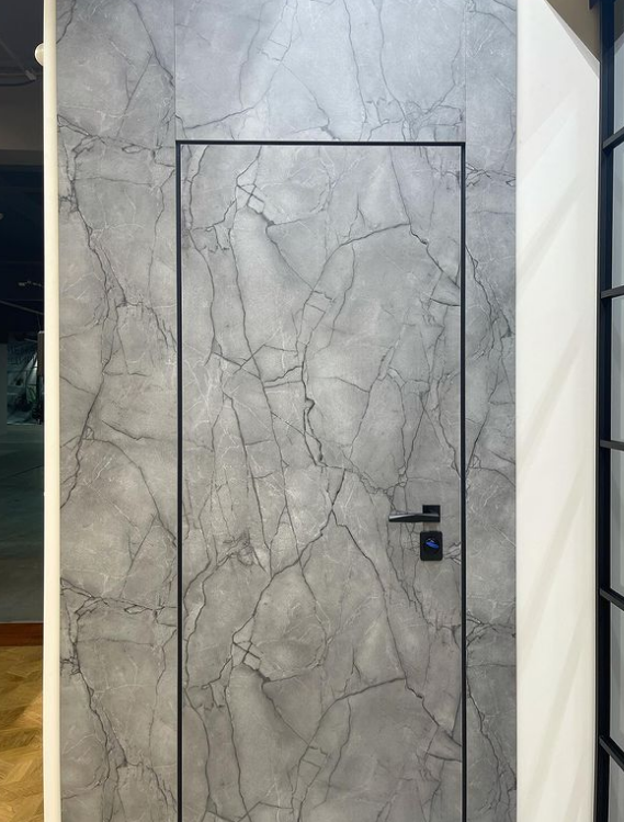 Современно и эстетично. Добавить графичности или сделать акцент именно на скрытой двери помогут современные отделки, например, шпонированные панели или оформление антивандальным материалом с имитацией природного камня. Бонус - возможность изменения облика в соответствии с новыми требованиями интерьера.
