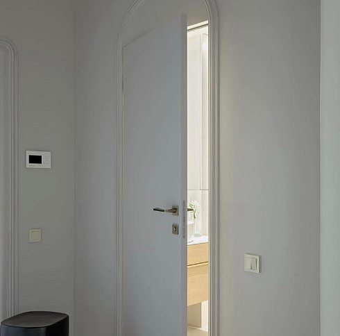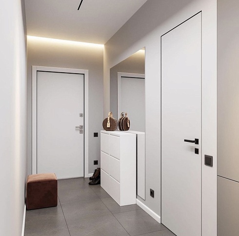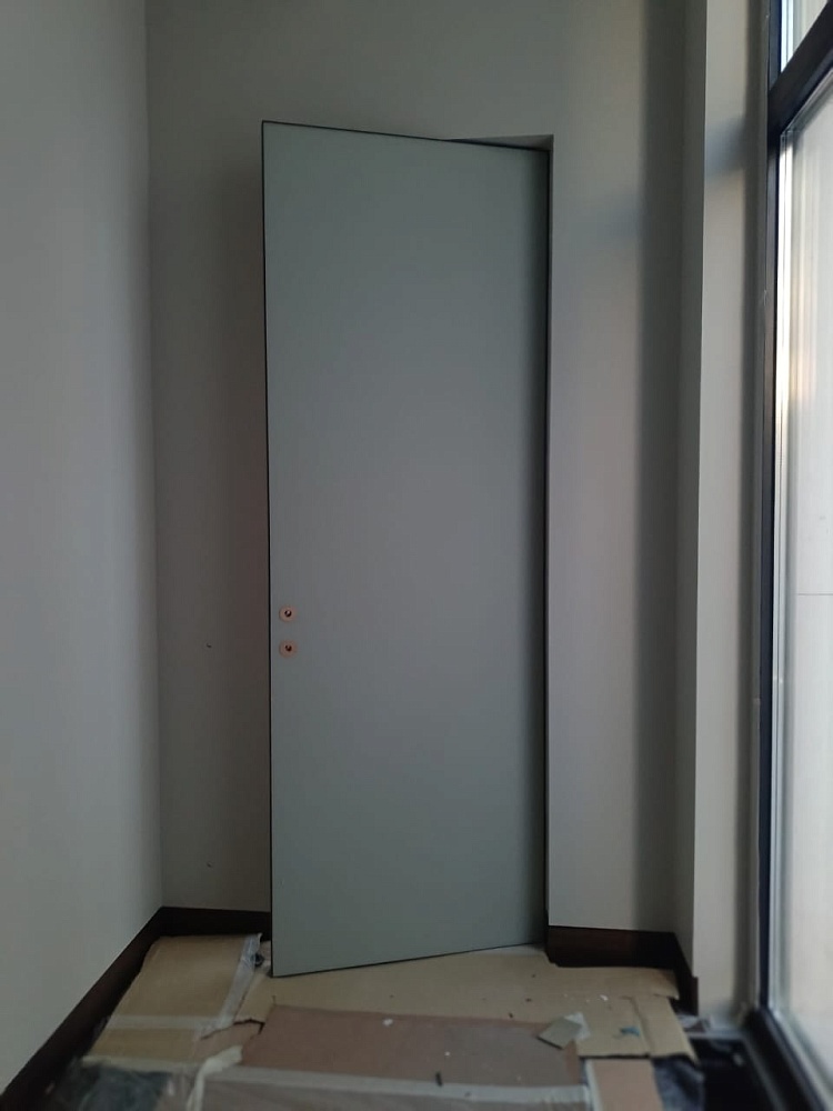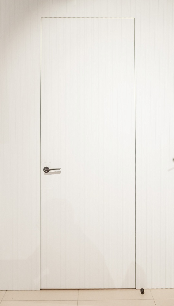 Дверь, которая растворится в дизайнерском пространстве. Универсальное решение - гладкое полотно со срытым коробом, обработанное белым грунтом.