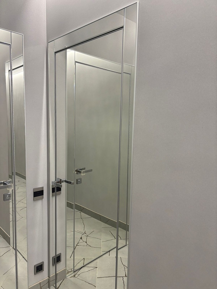 В производстве дверных полотен распространены стеклянные, пластиковые и металлические материалы. Использование зеркал и отражающих поверхностей рассеивает свет, что позволяет визуально увеличивать площадь квартиры.